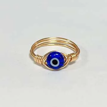 COLORFUL BLING Evil Eye Bead Knuckle Stackable Finger Ring Gold Wire Wrap Ring Healing for Women Stacking Band Ring Jewelry Twining Winding Turkish Amulet Lucky Multi Size-9 Blue