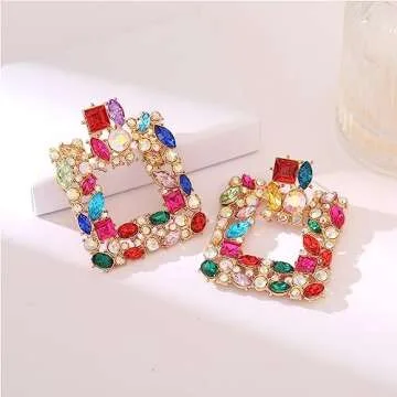 Colorful Vintage Rhinestone Square Statement Earrings Sparkly Geometric Crystal Drop Dangle Earrings Fashion Jewelry Gift for Women