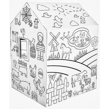 Show more Introducing the ColorJo “Good Morning Barn” Color Your Own Playhouse – a unique blend of creativity, adventure, and imaginative play for your children. Designed specifically for kids aged 3 and up, this delightful playhouse is not just a toy; it's a canvas for their artistic expressions and a portal into their very own farmyard adventure. Made from 100% eco-friendly and 100% recyclable cardboard, this playhouse is built to withstand the lively imaginations of your little ones while being gentle on the planet.