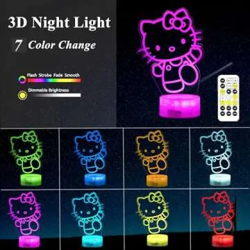 Show more Discover the enchanting Colortown Cute Night Light – Anime Character, a delightful 3D illusion lamp that transforms any space into a whimsical haven. Showcasing beloved characters, such as Hello Kitty and Cinnamoroll, this lamp is perfect for children's bedrooms, nurseries, or gaming areas. Its captivating design creates an amazing 3D visual effect when illuminated, ensuring your child will be mesmerized while enjoying a comforting glow at night. With functionalities like color change and brightness adjustment, you can customize the ambiance from the comfort of your bed.