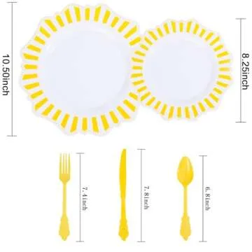 COLOSUS 150pcs Disposable White Lemon Yellow Striped Plastic Party Plates and Silverware set, Yellow Printed Dinner/Dessert Plates silverware serve 30guests for Birthday Weeding Party and Daily use.