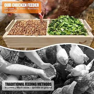 Show more Introducing the COLRASN Chicken Picnic Table, a delightful addition to your poultry setup that not only serves as a unique feeder but also enhances the joy of feeding your chickens, ducks, and other backyard birds. Crafted from high-quality natural solid wood, this charming handmade feeder is designed to keep their food clean and off the ground, thereby reducing waste and mess. Measuring 15.7" L x 15" W x 10" H, it offers the perfect space for your feathered friends to gather and enjoy their meals. The rustic design also adds an aesthetic charm to your chicken coop while promoting a fun feeding experience for both you and your birds.