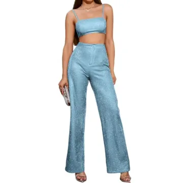 Show more Introducing the stunning Colysmo Women's Two Piece Outfit, a dazzling addition to your wardrobe that is sure to turn heads at any event. This exquisite two-piece set, created by a leading fashion brand, combines elegance and comfort effectively. Crafted from a luxurious blend of 70% Polyester and 30% metallized fibers, this ensemble is not only soft but also provides a flattering silhouette that hugs your curves in all the right places. The standout features include a chic sleeveless camisole with adjustable spaghetti straps and a secure back zipper for easy dressing, paired perfectly with high-waisted wide-leg pants designed to elongate your legs and create a slender look.