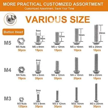 This comprehensive kit includes 500 meticulously assorted pieces of screws and nuts in standard sizes M3, M4, and M5, providing the versatility you need for countless projects. The robust storage case keeps everything organized, allowing you to quickly access the right fastener without the hassle of a messy workspace. With this set, you'll spend more time accomplishing tasks and less time searching for the right parts.