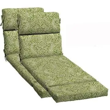 Show more Transform your outdoor space into a cozy retreat with the Comfort Classics Inc. Set of 2 Outdoor Green Stencil Damask Standard Patio Chair Cushions. Measuring at 74x22x4.5 inches in a vibrant green design, these cushions are the perfect upgrade to your chaise lounge, offering exceptional comfort and style. The brand has over 50 years of experience in the outdoor cushion industry, ensuring each product is crafted with care and expertise. Crafted from high-quality spun polyester, these cushions are built to withstand the elements while providing a plush seating experience.