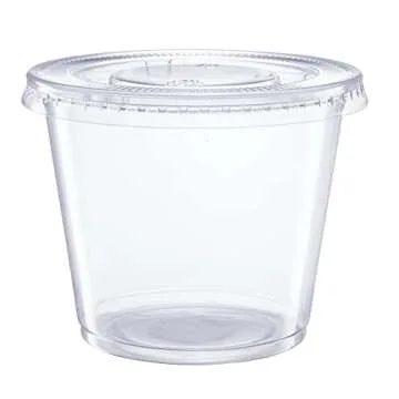 Show more Discover the ultimate solution for all your portioning needs with our reliable and durable Disposable Condiment Cups with Lids. Crafted from sturdy plastic, these cups are built to withstand the rigors of handling and transportation without bending or breaking. Perfect for parties, gatherings, or simply organizing your kitchen, they ensure a dependable way to serve everything from condiments to snacks. Each cup holds 5.5 oz, making them ideal for small, precise servings that cater to a variety of uses.