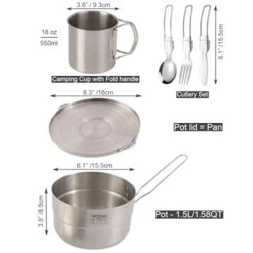 Show more Introducing the Compact Camping Pot Backpack Mess Kit, the ultimate solution for outdoor enthusiasts who value efficiency and convenience. This all-in-one cooking set is designed for 1 to 2 people, making it perfect for solo adventurers or couples looking to enjoy a meal in nature. Crafted from durable 18/8 stainless steel, this mess kit is not only lightweight at just 1.4 lbs (630g), but also built to withstand the rigors of camping and hiking. It includes a 1.58QT/1.5L Cooking Pot, a versatile pot lid that doubles as a pan, an 18oz Camping Cup, a set of folding utensils (fork, knife, spoon), and convenient storage bags, including a mesh bag that keeps everything organized and easily accessible.