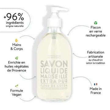 Show moreIndulge yourself in a transcendent hand and body washing experience with our luxurious French Savon de Marseille Extra Pure Liquid Soap. Encased in a stunning 16.7 Fl Oz glass bottle with a convenient pump dispenser, this soap combines elegance and functionality, making it a perfect addition to any home. Its delicate, floral, and powdery fragrance evokes the soft comfort of cotton, providing you more than just a clean; it offers a sensorial journey.