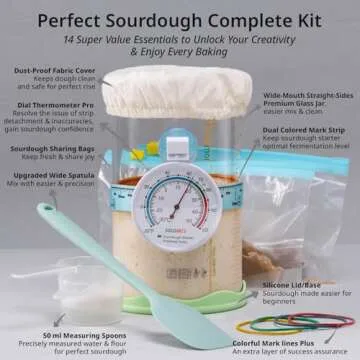 Show moreIntroducing the Complete 14-in-1 Sourdough Starter Kit, your ultimate solution for hassle-free sourdough fermentation! This thoughtfully packed kit includes everything you need to cultivate and maintain a thriving sourdough starter - whether you're a beginner or a seasoned pro. At the heart of this kit is a premium borosilicate glass jar, renowned for its durability and ability to withstand high temperatures. Say goodbye to fragile mason jars! With a generous capacity of 38.8 ounces, this wide-mouth jar features straight sides, making it easy to mix and harvest your bubbling starter without the mess.