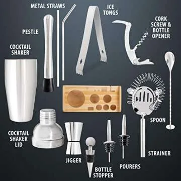 Show more Introducing the ultimate Complete Bartender Kit, a 13-piece cocktail mixing set expertly designed to elevate your home bar experience. This premium kit features everything you need to craft impressive beverages, complete with a sleek cocktail shaker, jigger, strainer, twisted spoon, muddler, and even ice tongs and a wine opener. Brought to you by a leading brand renowned for quality kitchenware, this set is the perfect blend of functionality and style. Whether you're a novice or a seasoned mixologist, you'll appreciate the elegance and efficiency this set adds to your cocktail-making adventures.