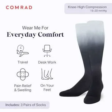 When compared to other compression socks in the market, the Comrad Knee High Socks stand out for their stylish design and effective compression technology. Many competitors offer basic designs without the added comfort and moisture-wicking features. This sock pack not only includes three pairs in a chic Black Ombre color but is also made from high-quality materials focusing on breathability and comfort throughout the day.