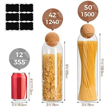 Show more Introducing the ComSaf 50oz Glass Storage Container with Ball Cork, a versatile and stylish addition to your home that redefines organization and aesthetics. This tall spaghetti container isn't just engineered to store your favorite dry foods like spaghetti, pasta, beans, sugar, and flour; it also serves as a beautiful home decor piece. Crafted from premium high borosilicate glass, it boasts a crystal-clear finish that makes it easy to view contents while keeping them fresh and free from dust. With a unique cork round ball seal, you can be assured that the ingredients stored inside are safely isolated from bugs and contaminants, prolonging their usability and freshness. Less
