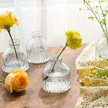 Show moreIntroducing the ComSaf Glass Bud Vases Set of 6, a delightful collection of petite floral vessels crafted from high-quality tempered glass. Each glass vase showcases a vintage-inspired design complemented by an intricate etched pattern, enhancing the aesthetic allure of your floral arrangements. Their clear and weighty construction not only accentuates the beauty of fresh blooms but also offers a striking visual appeal that seamlessly integrates into any home decor style. With a perfect size of about 3 inches in diameter and 3.5 inches in height, these mini bud vases can elevate your space while taking up minimal counter or shelf space.