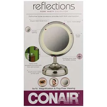 Transform your beauty routine with the Conair Double-Sided Lighted Mirror, expertly designed to provide unparalleled convenience and precision in your personal grooming. Featuring a stunning satin nickel finish, this elegant mirror not only serves a functional purpose but also enhances the aesthetic of your space. The smooth, double-sided design offers both 1x and 5x magnification, allowing you to effortlessly apply makeup, groom eyebrows, or get your skincare just right, no matter the task.
