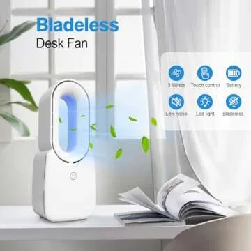 CONBOLA Rechargeable Desk Fan, Bladeless Battery Operated Fan Small USB Quiet Table Fan, 11.8 Inch Personal Fan with Touch Control 5-Colors Decorative LED Light for Office Bedroom, White