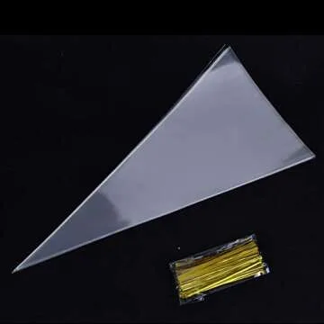Show moreIntroducing the Cone Bag 100 PCS Clear Cello Treat Bags, where functionality meets aesthetic appeal! Crafted from high-quality food-grade OPP, these transparent bags are as clear as glass, allowing you to showcase your delicious treats in style. With a generous size of 7 by 15 inches, each bag offers flexibility for various goodies, from candies and nuts to popcorn and homemade cookies. The cute triangular design adds a charming touch to your packaging, making these bags perfect for events, parties, or simple gifts. With over 100 twist ties included, elegantly seal your treats with golden decorative flair, ensuring freshness and a delightful presentation.