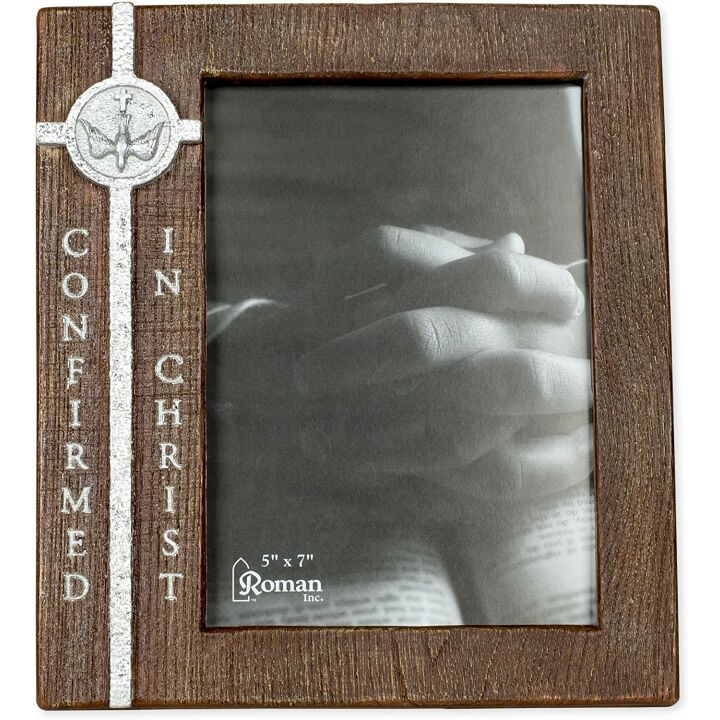 Key features of the 'Confirmed in Christ' frame include its durable resin stoneware construction, which ensures longevity and resilience. The natural wood-like finish provides a rustic charm, enhancing any decor. Measuring 8 x 7.25 inches, it fits a 5 x 7 photo—perfect for capturing significant memories. Its versatility as both a freestanding piece and a wall-mounted frame makes it adaptable to any setting.