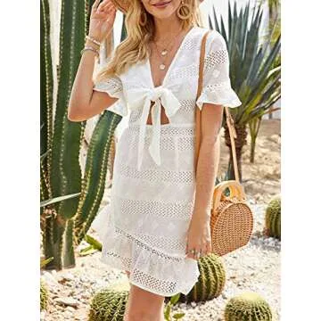 Show moreIntroducing the Conmoto Women's Sexy Short Sleeve Cotton Ruffle Mini Dress – a stunning blend of style, comfort, and sophistication. This dress is made from 100% high-quality cotton that ensures a soft touch against the skin while providing exceptional breathability. Whether you're stepping out for a casual day or attending a special evening event, this dress offers versatility thanks to its trending features. With a charming V-neck design, a flattering high waist cut, and a sexy hollow-out detail, this short dress combines elegance with a playful twist. The ruffle short sleeves and asymmetrical hem add a flirty vibe that will keep you feeling confident and chic, while the hidden zipper at the back ensures a seamless fit. The bow tie knot front and cut-out waist provide a unique silhouette, making this mini dress a must-have for any fashion-forward wardrobe. Enjoy the perfect above-knee length that balances boldness with taste. Less