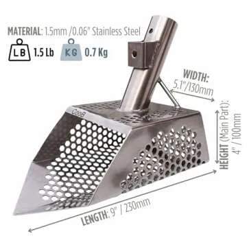 Show more Introducing the CooB Sand Scoop Metal Detector Tool Sharky, a meticulously crafted tool for metal detecting enthusiasts. This sand scoop is constructed from high-quality stainless steel with a thickness of 1.5mm, ensuring durability and resistance against wear and rust. The unique design features small 7mm (0.28″) hexahedron holes that optimize water and sand drainage, making it ideal for searching in both dry and wet sand conditions.