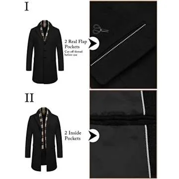 COOFANDY Men's Classic Long Trench Coat Wool Blend Winter Slim Fit Breasted Overcoat Warm Dress Coat with Plaid Scarf (Grey S)
