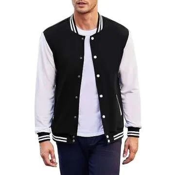 Show moreIntroducing the COOFANDY Men's Varsity Bomber Jacket, an innovative blend of style and function that epitomizes sporty sophistication. Crafted meticulously for those who appreciate both elegance and comfort, this jacket boasts a light and thin design, perfect for transitioning between the chilly pockets of Autumn and the briskness of early Winter. Ideal for both casual outings and gym sessions, it's a versatile addition to your wardrobe that keeps you warm without compromising on aesthetics. Featuring classic varsity elements like a button closure and ribbed cuffs, collar, and hem, this jacket is designed to flatter.