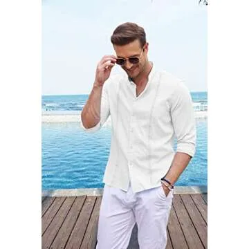 Show more Introducing the COOFANDY Men's Casual Button Down Shirt, your ultimate companion for style and comfort this summer! This delightful white Hawaiian shirt is expertly crafted from premium fabric that is not only soft but also incredibly lightweight and breathable. Whether you're heading to the beach, attending a casual party, or simply enjoying a sunny day out, this shirt promises to keep you cool and relaxed. The elegant long sleeve design combined with a button-down closure and modern band collar makes it a versatile choice for all occasions. Embrace the seasonal warmth and look effortlessly handsome with this chic addition to your wardrobe.