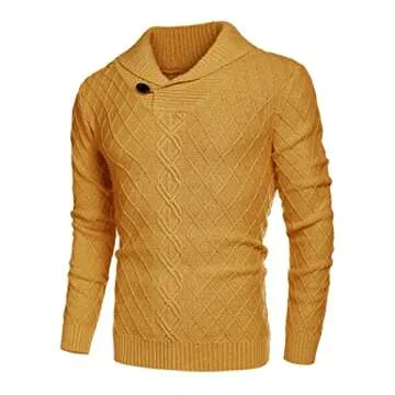 Show moreIntroducing the COOFANDY Mens Shawl Collar Sweater, the ultimate blend of style, comfort, and functionality perfect for the chilly fall and winter months. This luxurious sweater features a unique cable knitted pattern that not only looks stunning but also provides excellent insulation against the cold. The renowned brand COOFANDY has designed this pullover with a modern shawl collar, elevating the classic look with a contemporary twist. It's crafted from high-quality fabric that ensures durability and longevity while maintaining a soft and comfortable feel against the skin. With its vibrant yellow hue, this sweater is a standout addition to any wardrobe, guaranteed to add a pop of color to those dreary winter days.