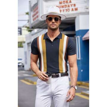 COOFANDY Mens Vintage Stripe Knit Polo Shirt Button Golf Sweater, Navy Blue & Yellow, Large, Short Sleeve