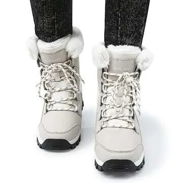 Show more Experience the perfect blend of style and functionality with these womens lace-up ankle snow boots. Designed for the modern woman, these boots are crafted from durable leather and windbreaker cloth, offering an elegant look that is sure to turn heads. The comfy white padded collar adds a touch of sophistication while providing extra comfort and support for your ankles.