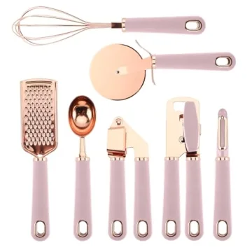 Show moreTransform your cooking experience with the COOK WITH COLOR 7 Pc Kitchen Gadget Set. This stunning ensemble of kitchen utensils blends functionality and elegance, making it the perfect accessory for your modern kitchen. Each gadget features a chic copper coating with delightful pink soft-touch handles, ensuring that not only do they perform exceptionally well, but they also add a vibrant touch to your kitchen decor. The set includes essential tools such as a can opener, ice cream scooper, peeler, pizza cutter, garlic press, cheese grater, and whisk, all engineered for ease of use and maximum comfort.