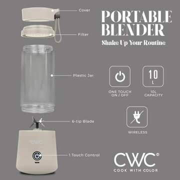 COOK WITH COLOR Mini Portable Blender - 250W Power, 12oz Capacity, Stainless Steel Blade, Wireless/USB Rechargeable, Creme