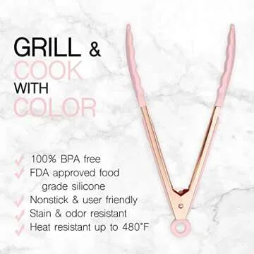 Crafted with stylish rose-gold accents and chic pink silicone heads, these tongs don’t just perform—they impress. Ideal for any cooking occasion, they make serving more elegant, allowing you to show off to your guests. Safety is of utmost importance, so our tongs are food contact safe, designed specifically to prevent burns and mitigate the risk of germ transfer.