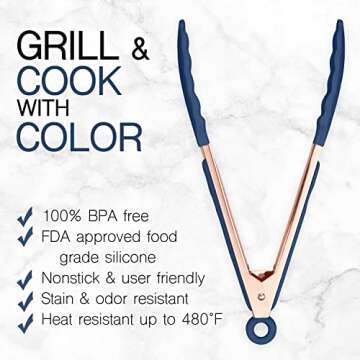 The elegant rose-gold color with navy accents adds a trendy flair to your cooking tools, making them perfect for impressing guests at your next barbecue or gathering. Safety and hygiene are top priorities for COOK WITH COLOR; these tongs are food contact safe, designed to prevent burns and avoid germs, ensuring peace of mind while you handle your favorite dishes.