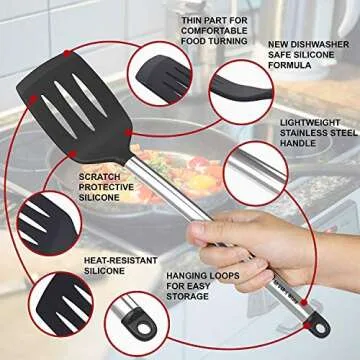 Cooking Silicone Utensils Set 10 — Best Nonstick Kitchen Cookware Utensil Sets — Large Hanging Spoons Spatula Set – Non Toxic Cook Gadget Kit Black