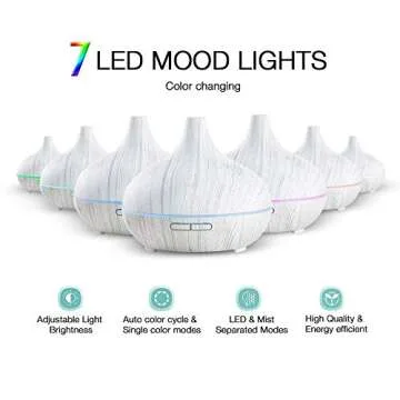 Show more Transform your space with our Cool Mist Humidifiers, expertly designed to enhance your environment through delightful mist and aromatherapy. This essential oil diffuser not only delivers soothing moisture to combat dryness but also features seven exquisite lighting options that can create the perfect ambiance for any moment. With its user-friendly controls and elegant style, it fits seamlessly into your bedroom, workplace, or living area, making it a multifunctional addition to your home essentials.