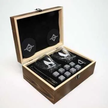 Cool Stones Whiskey Glass Gift Set - 2 Whiskey Glasses and Whiskey Stones with Tongs in Velvet Bag All Presented in an Elegant Wooden Box for Men (Vintage-Wood-Vintage-Rocks)
