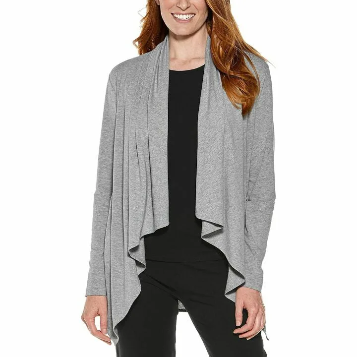 The Coolibar Shawl Collar Sun Wrap offers 98% UVA/UVB radiation protection, is made from incredibly soft and cool ZnO fabric, and features a chic design that can be dressed up or down for various occasions.