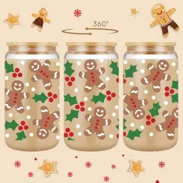 Coolife Holly Gingerbread Man Christmas Decorations, Gifts for Women Men - 16 oz Glass Cup Tumbler w/Straw Lid, Christmassy Preppy Glass Cups w/Lids Straws for Smoothie Iced Coffee Beer