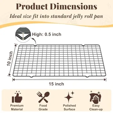 Show moreExperience the ultimate in versatility and durability with our Cooling Racks for Cooking and Baking. Made from high-quality stainless steel, these 10" x 15" grid wire baking racks are designed to withstand heavy loads without bending or deforming. The smooth polished surface ensures that there are no burrs, rust, or peeling, making it safe for all your food needs. Whether you're cooling cookies, roasting meats, or decorating desserts, these baking racks rise to every kitchen challenge. Ideal for both beginners and seasoned bakers alike, this set of two racks offers exceptional value and functionality in one package.