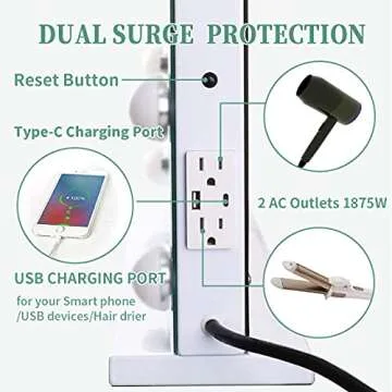Show moreStep into the spotlight with the COOLJEEN Large Hollywood Makeup Mirror, elegantly designed to bring glamour and functionality to your beauty routine. This stunning vanity mirror features 18 professional-grade LED bulbs that provide bright, adjustable lighting, ensuring you're always looking flawless. With a modern aesthetic in a sleek white finish, this mirror fits beautifully into any décor. You can choose from three color lighting modes—warm, cool, and natural—to perfectly match your environment, whether you’re preparing for a night out or just daily touch-ups. The added convenience of a protective power outlet and USB charging port means your devices are always at hand, making your beauty regimen even more efficient.