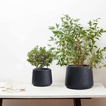 Show more Introducing the Copenhagen Matt Black Ceramic Plant Pot Set, an exquisite duo designed to elevate your botanical displays while perfectly complementing any décor. Crafted from high-quality ceramic cement, these planters feature a stunning textured matte black finish that seamlessly transitions from contemporary to classical settings. Measuring 9" and 6" in diameter respectively, these pots add sophistication to your indoor or outdoor spaces. Plant your favorite blooms or greenery and watch as they flourish in these stylish yet functional pots.