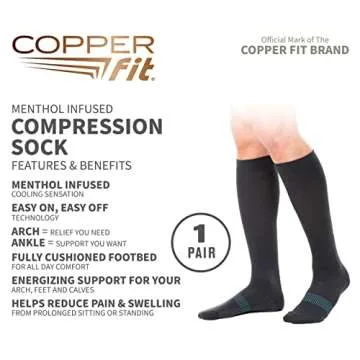 Show moreStep into comfort and revitalization with the Copper Fit ICE Compression Socks. Infused with the healing properties of menthol and the energizing benefits of CoQ10, these socks are not just about support; they're a revolutionary blend of wellness and advanced fabric technology. Designed for those who spend long hours on their feet, these compression socks use a unique micro-encapsulation technology to deliver soothing sensations directly to your skin.