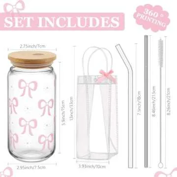Coquette Bow Aesthetic Cup with Clear Gift Bag, Glass Cups with Lids and Straws, 16 oz Iced Coffee Smoothie, Beer Glass Cup Tumbler Trendy Glass Cup for Girls Bestfriend Sister Girlfriend (Pink Bow)