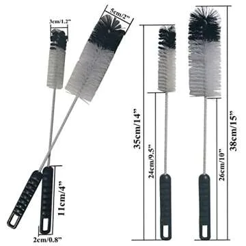 Show more Introducing the Coralpearl Bottle Cleaning Brush Set, a perfect blend of innovation and practicality designed for effortless cleaning of your favorite containers. This handy set includes two uniquely sized brushes, a Big brush measuring 38 cm (15 inches) in length with a 5 cm (2 inches) diameter, and a Small brush that is 35 cm (14 inches) long with a 3 cm (1.2 inches) diameter. Each brush features an ergonomically designed handle measuring 11 cm (4 inches) long and 2 cm (0.8 inches) wide, ensuring a comfortable grip that allows you to tackle even the toughest cleaning jobs with ease.