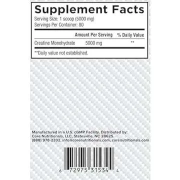 Show moreIntroducing the Core Nutritionals Creatine, a potent and effective supplement designed to enhance your fitness journey. With a powerful dose of 5000 mg per serving and a total of 80 servings in each jar, this creatine supplement is engineered to boost muscle mass, improve strength, and elevate your overall performance during high-intensity workouts. Perfect for athletes and fitness enthusiasts alike, Core Nutritionals Creatine delivers unparalleled support for resistance training programs, helping you achieve your physique goals with efficacy.