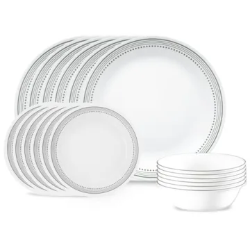 Show moreExperience the delightful fusion of durability and elegance with the Corelle 18-Piece Dinnerware Set. This exquisite set includes everything you need for a full table service of 6 people: (6) 10-1/4-inch dinner plates, (6) 6-3/4-inch appetizer plates, and (6) 18-oz soup/cereal bowls. Proudly crafted in Corning, New York, Corelle has been a trusted name in dinnerware since 1970, renowned for its triple-layer-strong glass construction that resists chips and cracks. This lightweight design not only makes handling a breeze but also allows for compact stacking, taking up half the space of conventional ceramic dishes. Enjoy the peace of mind that comes with a 3-year limited warranty, knowing your investment is protected.