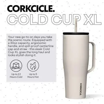 Show more Introducing the Corkcicle Cold Cup XL Insulated Tumbler with Handle, Lid, & Straw—a stylish and functional solution for staying hydrated on the go! With a generous capacity of 30 oz, this tumbler is perfect for your morning coffee, refreshing iced tea, or ice-cold water during those hot summer days. Built with triple insulation technology, it keeps your drinks cold for up to 12 hours, ensuring you enjoy every sip of your favorite beverages at the perfect temperature. Its sleek design not only looks great but also fits effortlessly into standard cupholders, making it ideal for road trips or daily commutes.