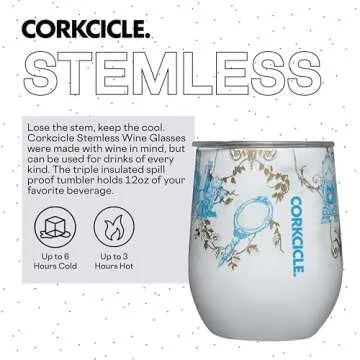 Show more Introducing the Corkcicle Disney Princess Belle Stemless Wine Glass Tumbler—where elegance meets functionality! This exquisite tumbler is designed with triple insulated stainless steel technology, ensuring your favorite beverages stay cold for up to 9 hours. Whether you're sipping a delicate wine, enjoying a refreshing cocktail, or even indulging in a decadent frozen drink, this tumbler makes every experience delightful. Its charming Belle design blends adventure and sophistication, making it the ultimate choice for Disney enthusiasts and cocktail connoisseurs alike.