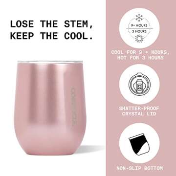 Show more Introducing the Corkcicle Luxe Collection 12 Oz Triple Insulated Stainless Steel Stemless Travel Cup in a stunning Rose Metallic finish. This premium travel cup is not just about looks; it's designed specifically for the modern lifestyle, maintaining your beverages at the ideal temperature. Whether you're sipping a hot coffee in the morning or enjoying a chilled rosé during summer picnics, this cup keeps your drinks the way you want them: cold for up to 9 hours or hot for 3 hours! Its sleek, stemless glass silhouette adds elegance, while the food-grade stainless steel construction ensures durability. Plus, with the no-slip bottom, you can place it anywhere without fear of spills, making it perfect for any setting.