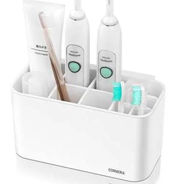 Show more Introducing the CORNERIA Toothbrush Holders, a multifunctional solution designed for modern oral care enthusiasts. This innovative toothbrush caddy not only organizes your electric toothbrushes with style but also features a dedicated toothpaste stand for effortless access. Crafted with durable materials that ensure longevity, it offers a sleek design that fits seamlessly into any bathroom decor. The detachable components allow quick cleaning and customization, accommodating various toothbrush sizes with ease.